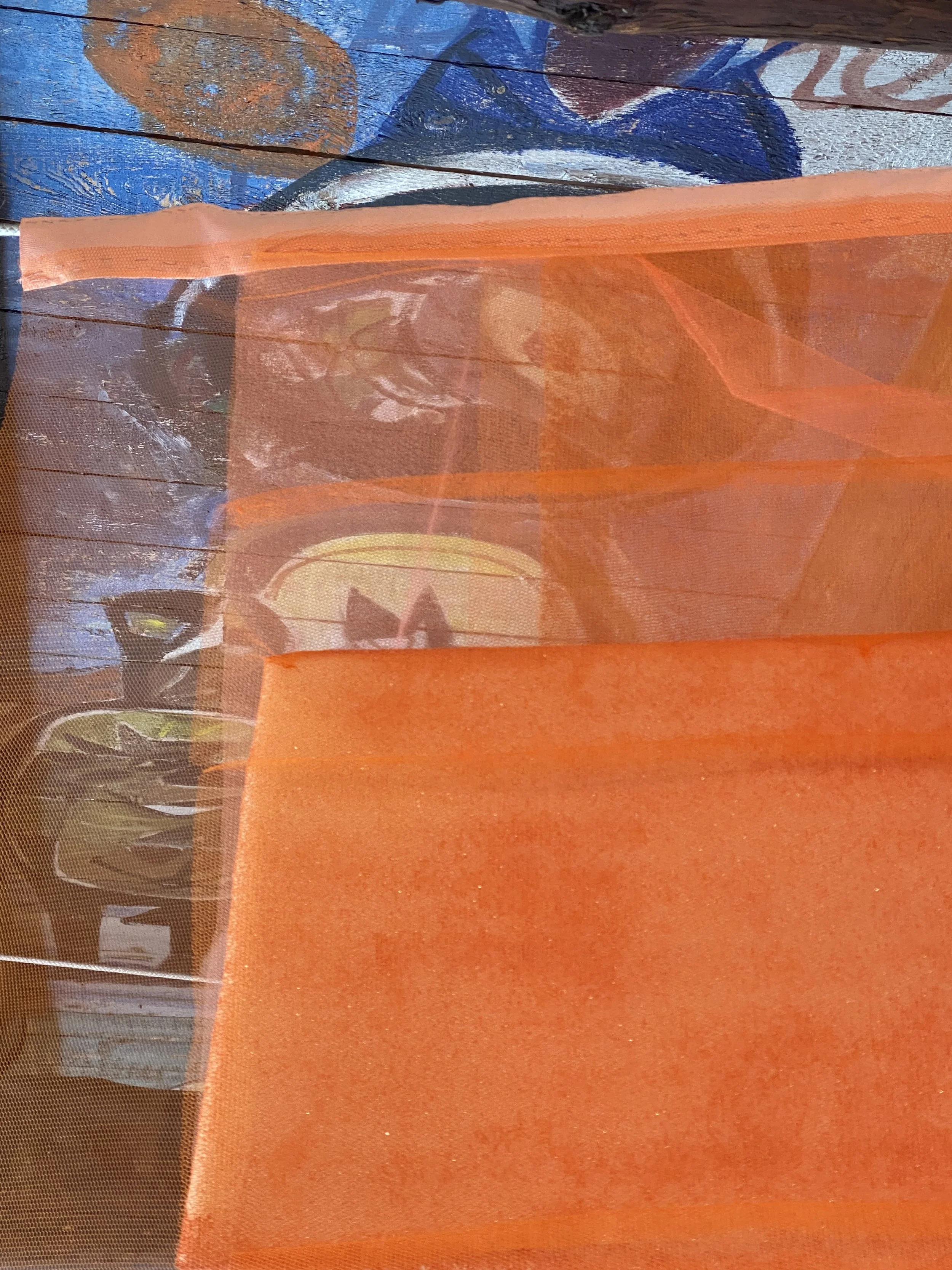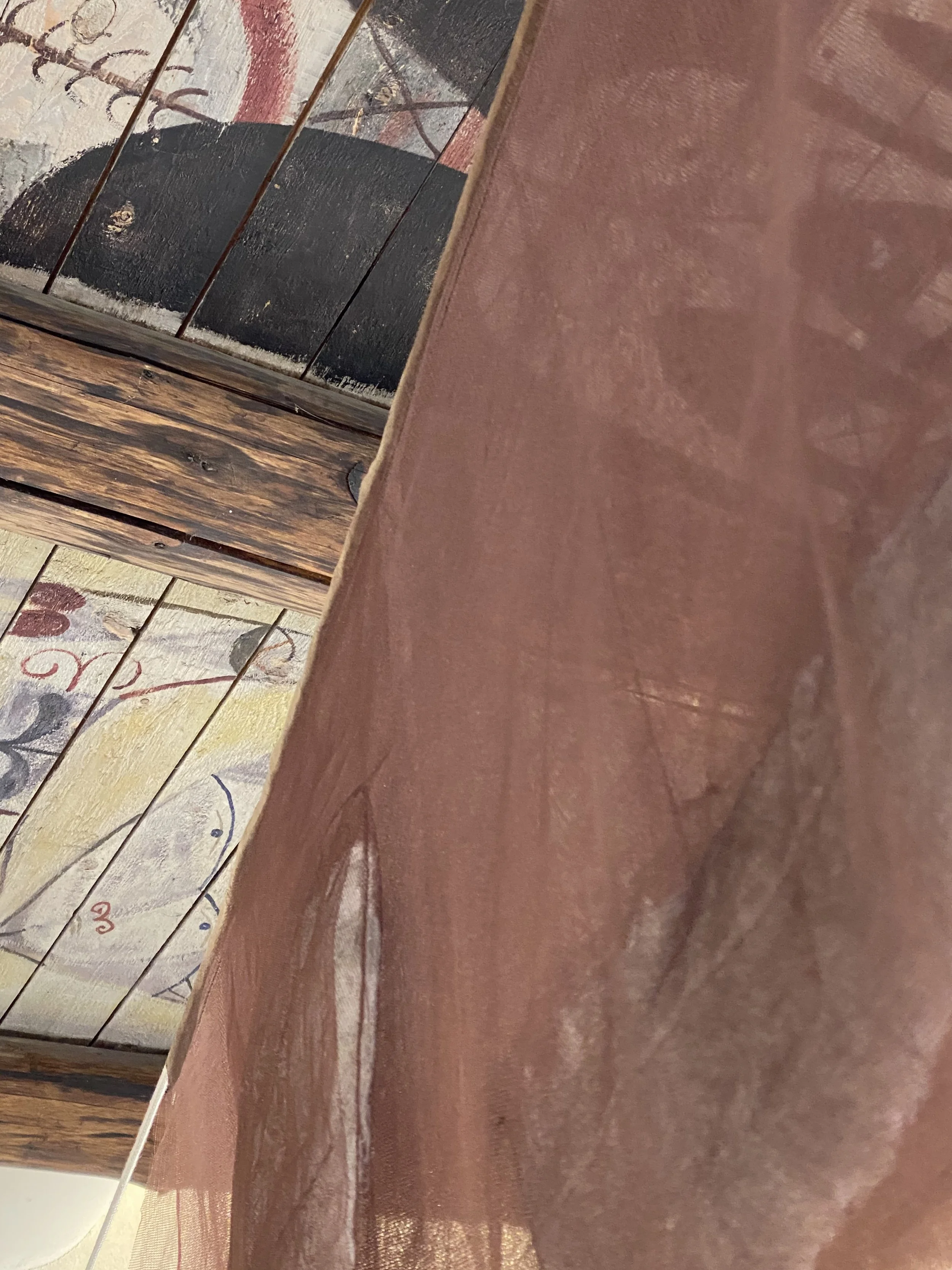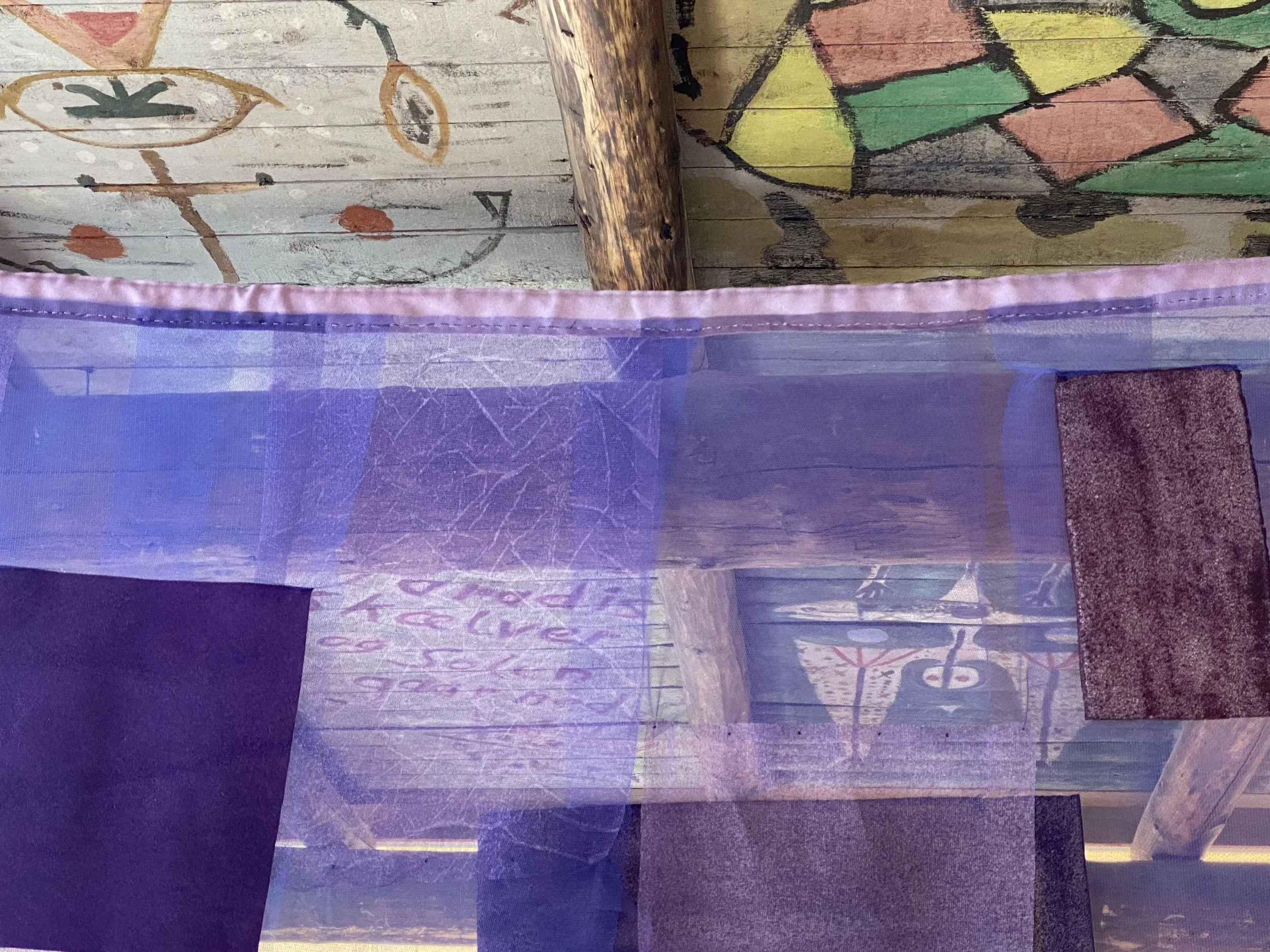 “The Cobra-room in itself is a beautiful and interesting room with a fantastic history, so I felt as an artist, that I had to deal with and enter into a dialogue with the ceiling and its Cobra paintings in particular! So I chose with my textile works to show a site-specific installation of works with emphasize on colour and transparency.”